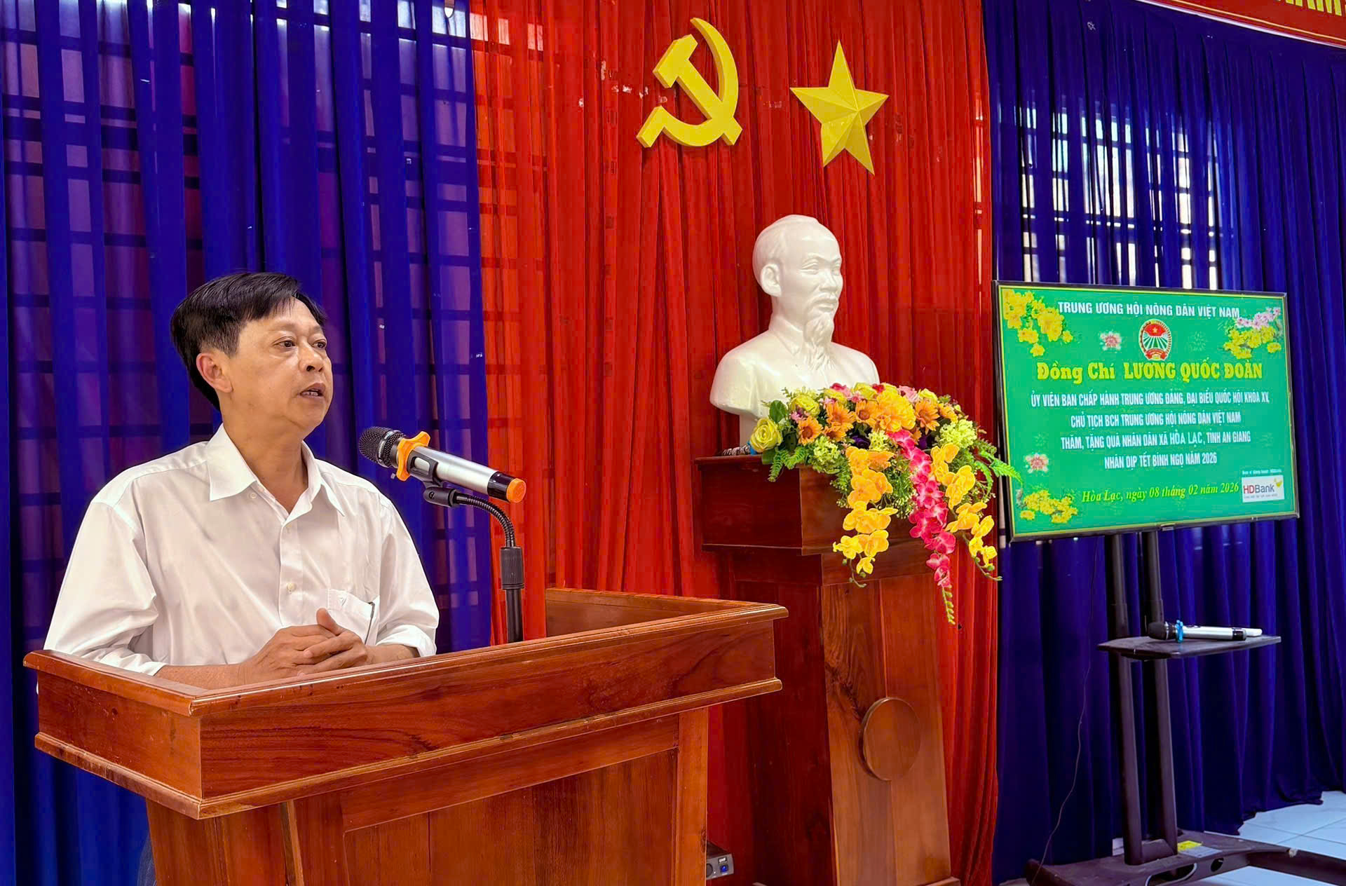 Ngày 08/02/2026, Ông Phan Tùng Lâm – Phó chủ tịch Hội Nông dân tỉnh An Giang dẫn đầu đoàn công tác Hội đến thăm và tặng quà tết cho Hội viên Nông dân xã Hòa Lạc (An Giang) có hoàn cảnh khó khăn nhân dịp xuân Bính Ngọ năm 2026.