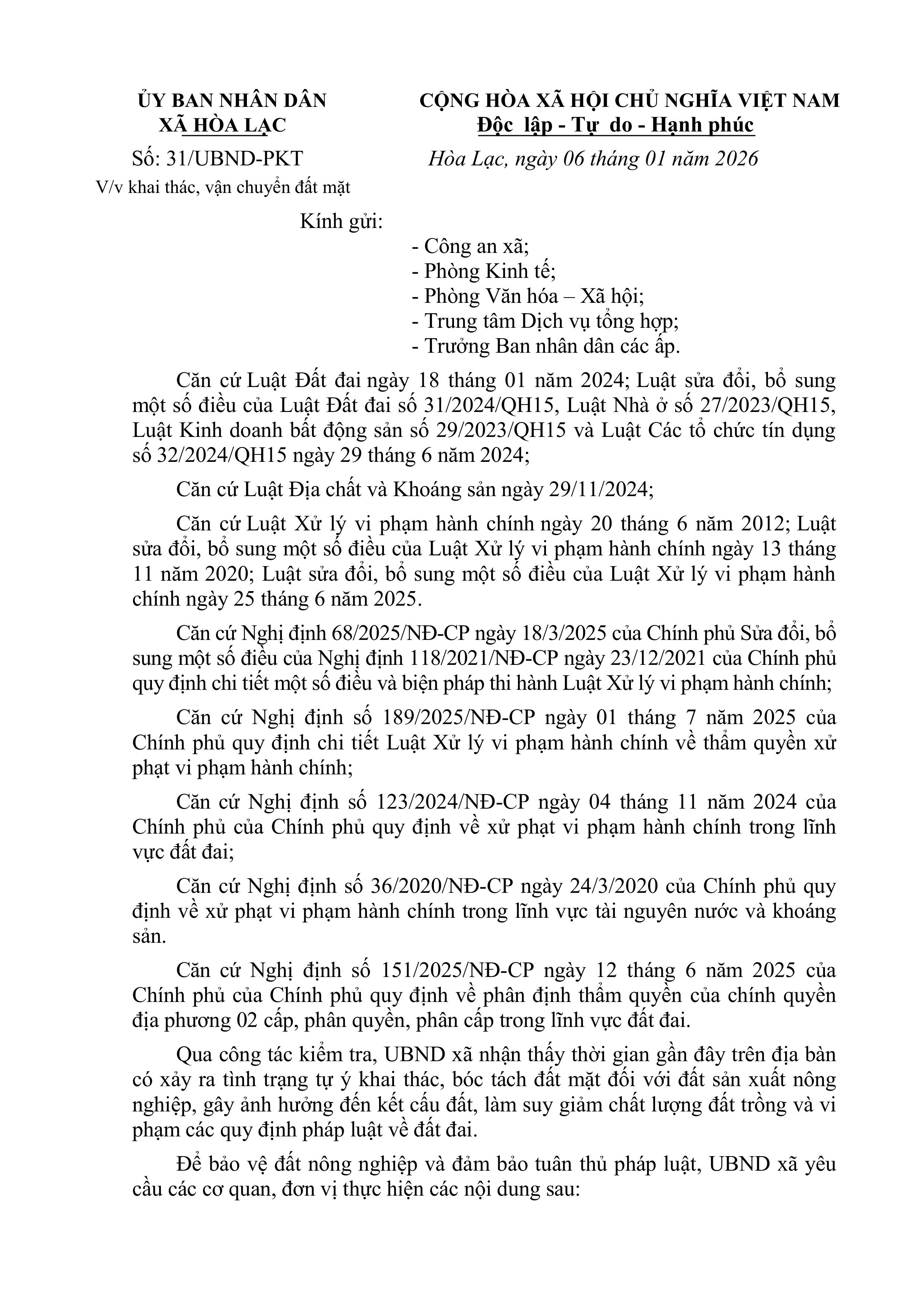 Công văn số 31 Về việc khai thác, vận chuyện đất mặt