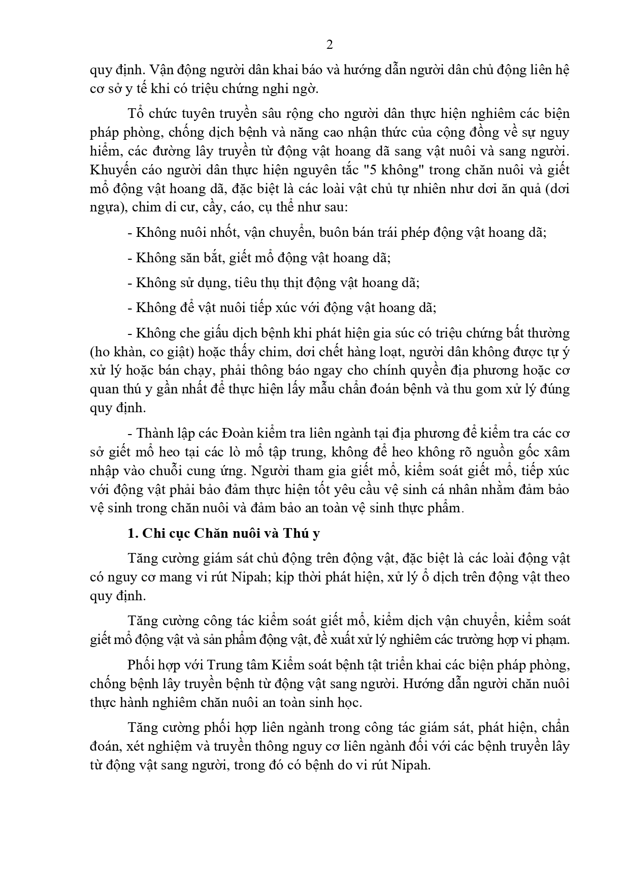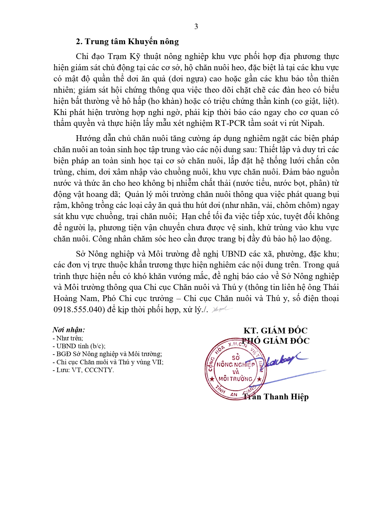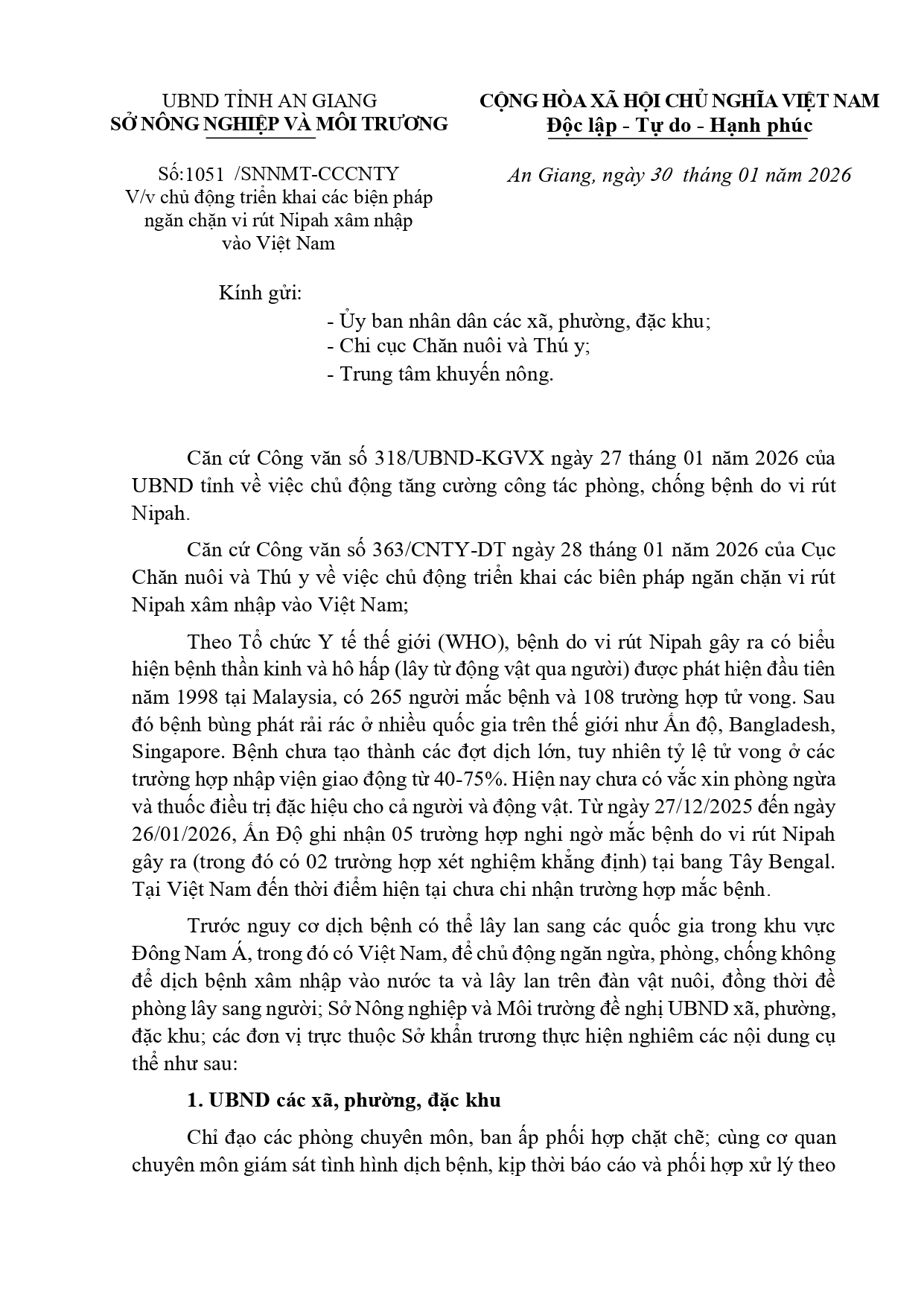 CV 1051 về việc chủ động triển khai các biện pháp ngăn chặn vi rút Nipah xâm nhập vào Việt Nam