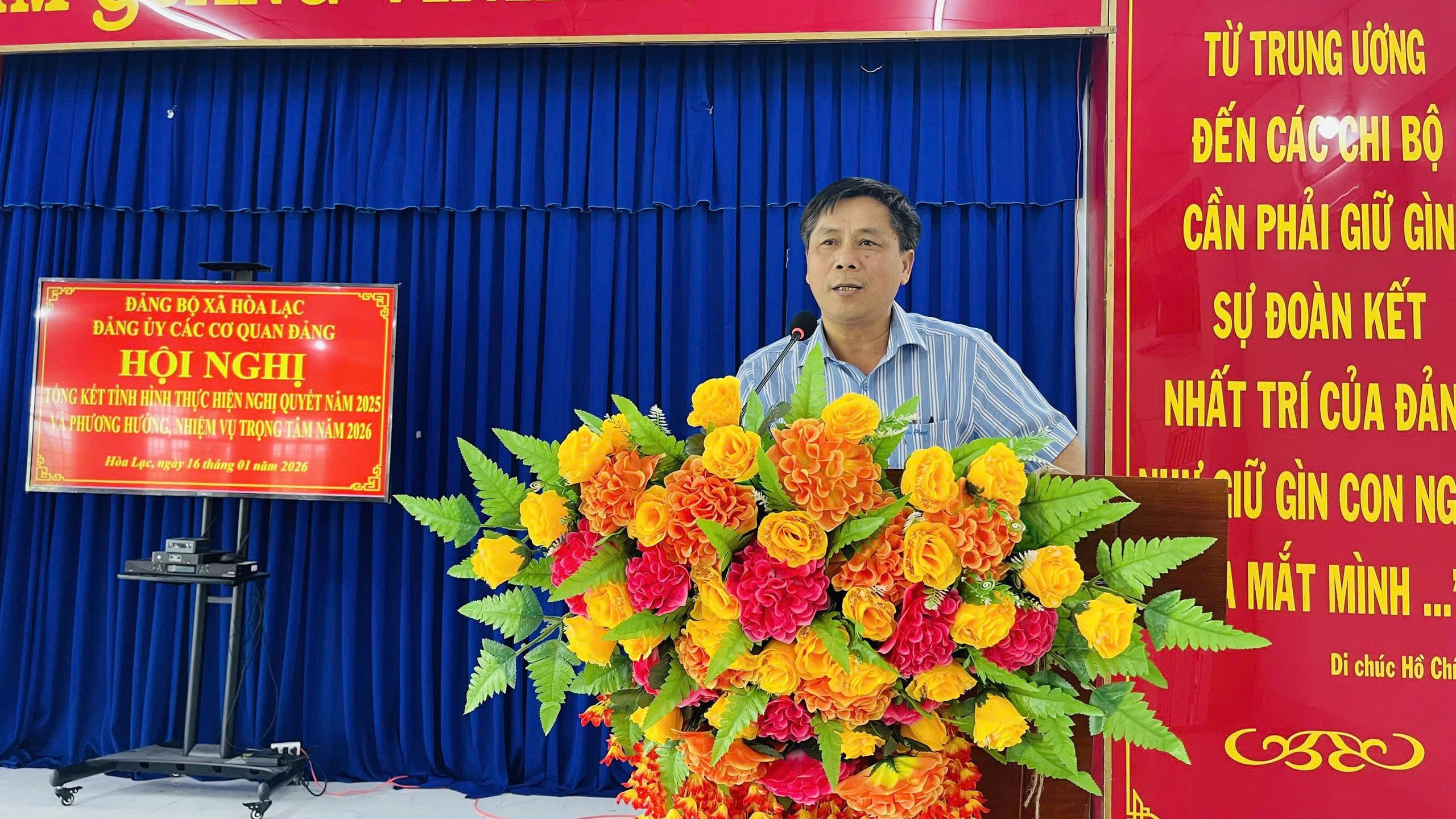Phát biểu chỉ đạo tại hội nghị, đồng chí Nguyễn Thành Ân – Bí thư Đảng ủy xã – Chủ tịch HĐND xã Hòa Lạc ghi nhận và biểu dương những kết quả Đảng bộ các cơ quan Đảng đạt được trong năm 2025; đồng thời, đề nghị Đảng bộ tiếp tục nâng cao năng lực lãnh đạo, phát huy vai trò nêu gương của cán bộ, đảng viên, đáp ứng yêu cầu nhiệm vụ trong tình hình mới; đẩy mạnh “Học tập và làm theo tư tưởng, đạo đức, phong cách Hồ Chí Minh”, từng chi bộ xây dựng mô hình học tập và làm theo gương Bác Hồ, Bác Tôn; Ủy ban MTTQ và các tổ chức chính trị - xã hội xã đổi mới nội dung phương thức hoạt động, phương thức tuyên truyền tập hợp đoàn viên hội viên thực hiện chủ trương của Đảng, chính sách pháp luật của nhà nước đặc biệt trong thực hiện các dự án triển khai trên địa bàn xã….