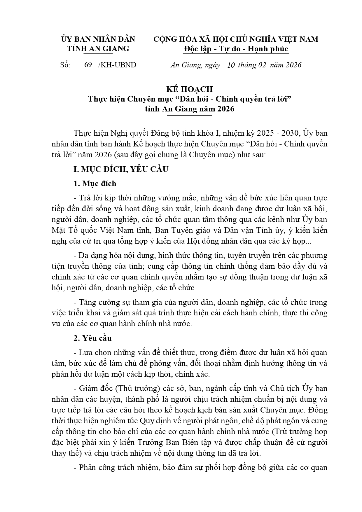 KẾ HOẠCH THỰC HIỆN CHUYÊN MỤC "DÂN HỎI-CHÍNH QUYỀN TRẢ LỜI" TỈNH AN GIANG NĂM 2026