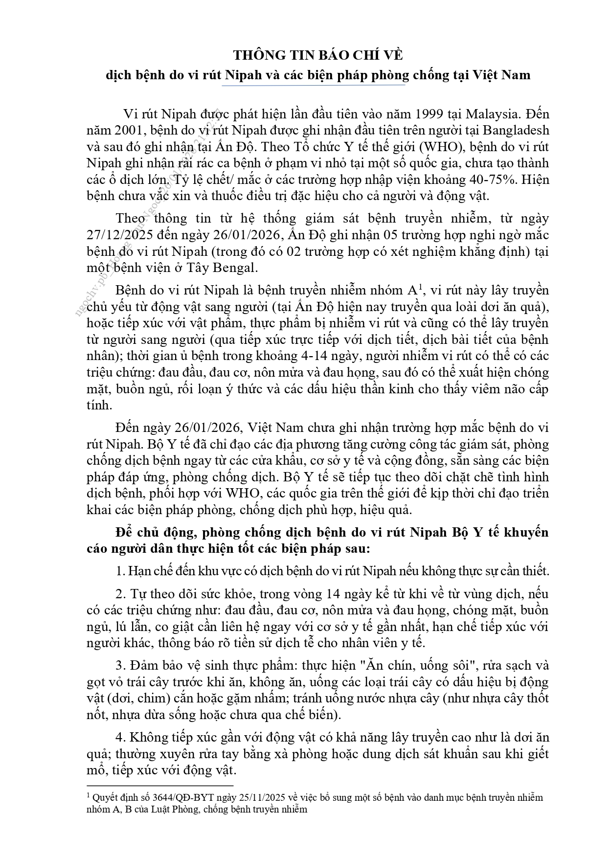 THÔNG TIN BÁO CHÍ VỀ DỊCH BỆNH DO VI RÚT NIPAH VÀ CAC BIỆN PHÁP PHÒNG CHỐNG TẠI VIỆT NAM